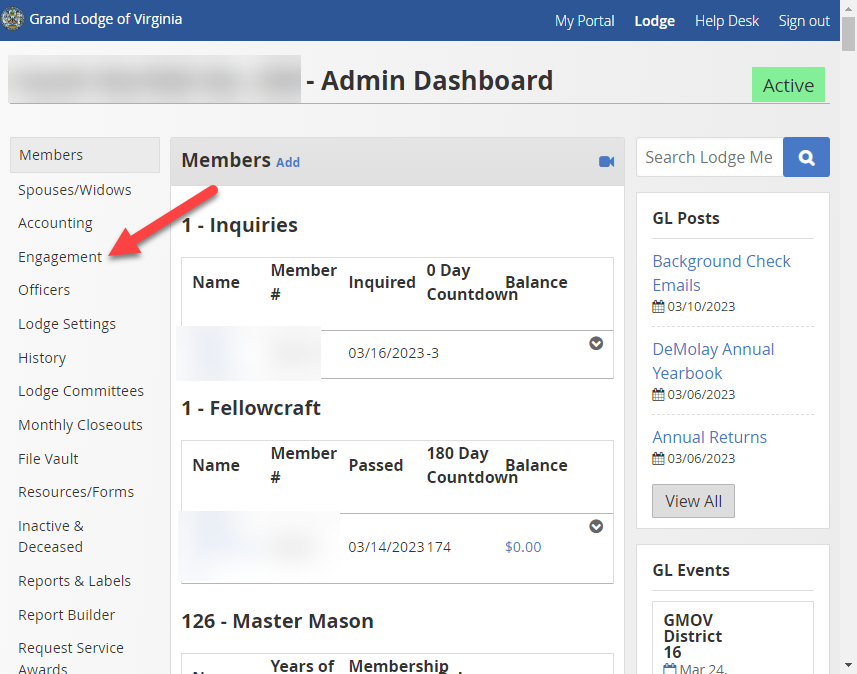 Log into the “Admin Dashboard” for your lodge within Grandview and select “Engagement” from menu.